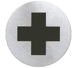 First Aid sign. 8cm diameter. Self adhesive backing for easy mounting of First Aid sign. Manufactured from Stainless steel. Suitable for doors or walls. Easy to clean.